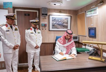 وكان في استقبال سموه لدى وصوله قاعدة الملك فيصل البحرية معالي رئيس هيئة الأركان العامة الفريق الأول الركن فياض بن حامد الرويلي، ومعالي رئيس أركان القوات البحرية الملكية السعودية الفريق الركن فھد بن عبدالله الغفيلي.