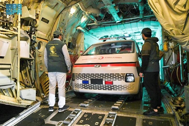وتحمل الطائرة على متنها سيارتي إسعاف، تمهيداً لنقلها إلى المتضررين من الشعب الفلسطيني اخل قطاع غزة.