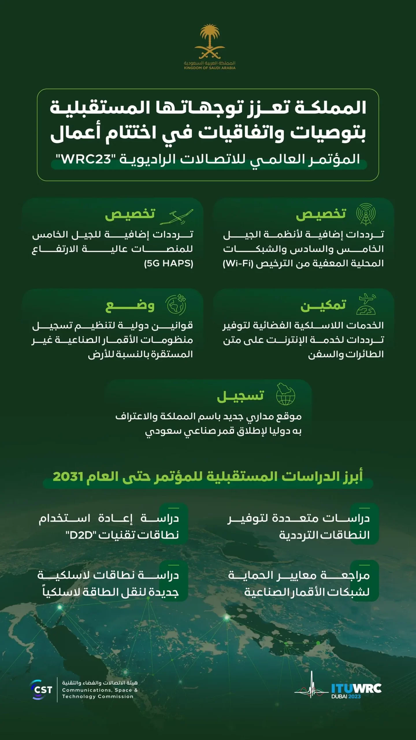ولفت النظر إلى أن المؤتمر حدّد العديد من الموضوعات المستقبلية لدراستها خلال الدورتين القادمتين والممتدة حتى العام 2031م، والتي تشمل دراسة توفير نطاقات ترددية إضافية (4،7،8،15) جيجاهرتز ونطاق التيراهرتز لأنظمة الجيل الخامس والسادس، ودراسة إعادة استخدام نطاقات شبكات الاتصالات المتنقلة عبر الأقمار الصناعية لتقنيات (direct-to-device) والذي سيعزز من الوصول العالمي لتقنيات الشبكات غير الأرضية (NTN)، ومراجعة معايير الحماية لشبكات الأقمار الصناعية غير المستقرة بالنسبة للأرض، والتي ستسهم في انتشار أعلى لشبكات النطاق العريض وخفض تكلفتها وضمان الاستدامة في الفضاء، بالإضافة إلى دراسة إمكانية تحديد نطاقات لاسلكية جديدة لنقل الطاقة لاسلكياً (wireless power transmission-WPT) والذي بدوره يخدم جهود الاستدامة القائمة في العديد من المشاريع الضخمة بالمملكة.