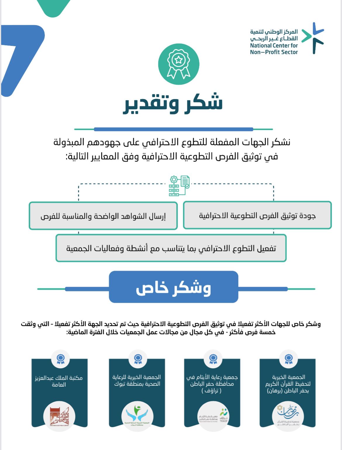 وأوضح المدير التنفيذي للجمعيه أ/ محمد البلوي أن المعايير التي تم وضعها من قبل المركز الوطني للقطاع غير الربحي تضمنت معيار جودة توثيق الفرص التطوعية الاحترافية وتفعيل التطوع الاحترافي بما يتناسب مع أنشطة وفعاليات الجمعية.