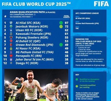 تصدّر فريق الهلال التصنيف الذي أصدره الاتحاد الدولي لكرة القدم (فيفا) للأندية الآسيوية، التي ستُشارك بكأس العالم للأندية 2025.