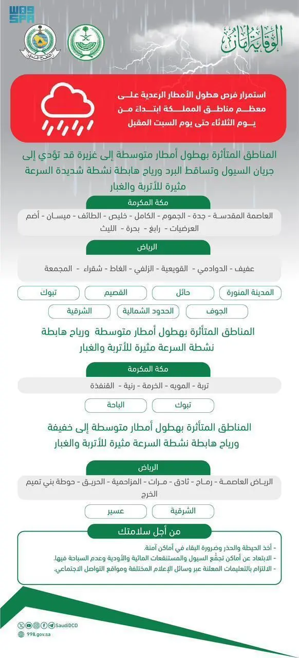 دعت المديرية العامة للدفاع المدني إلى الحيطة والحذر وضـرورة البقاء في أماكن آمنة والابتعاد عن أماكن تجمُّع السيول والمسـتنقعات المائية والأودية، وعدم السباحة فيها كونها أماكن غير مناسبة لذلك وتشكل خطورة، والالتزام بالتعليمات المعلنة عبر وسائل الإعلام المختلفة ومواقع التواصل الاجتماعي، وذلك لاستمرار فرص هطول الأمطار الرعدية على معظم مناطق المملكة، من يوم غدٍ الثلاثاء حتى يوم السبت المقبل.