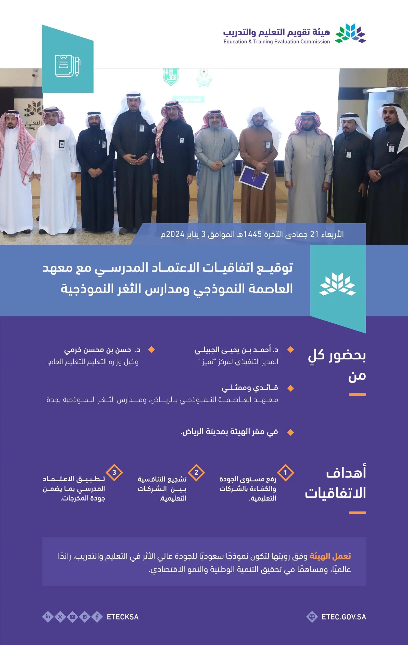 هيئة تقويم التعليم والتدريب توقع مع معهد العاصمة النموذجي ومدارس الثغر النموذجية اتفاقيات الاعتماد المدرسي