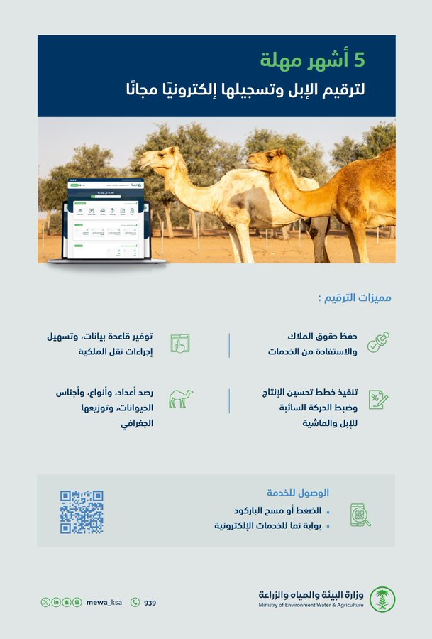 "البيئة" تُعلن عن مهلة (5) أشهر لترقيم الإبل وتسجيلها مجانًا عبر منصة "نما" الإلكترونية