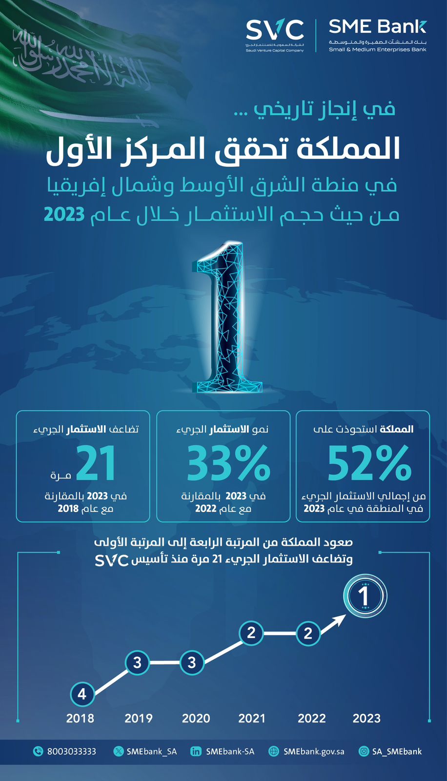 تصدرت المملكة العربية السعودية دول منطقة الشرق الأوسط وشمال أفريقيا، للمرة الأولى في إنجاز تاريخي جديد، من حيث إجمالي قيمة الاستثمار الجريء في عام 2023م حسب منصة “MAGNiTT” المتخصصة في إصدار بيانات الاستثمار الجريء في الشركات الناشئة في المنطقة، في انعكاس لما تشهده المملكة من تطور في مختلف القطاعات الاقتصادية والمالية في ظل رؤية المملكة 2030 وأهدافها لتعزيز الاقتصاد الوطني.