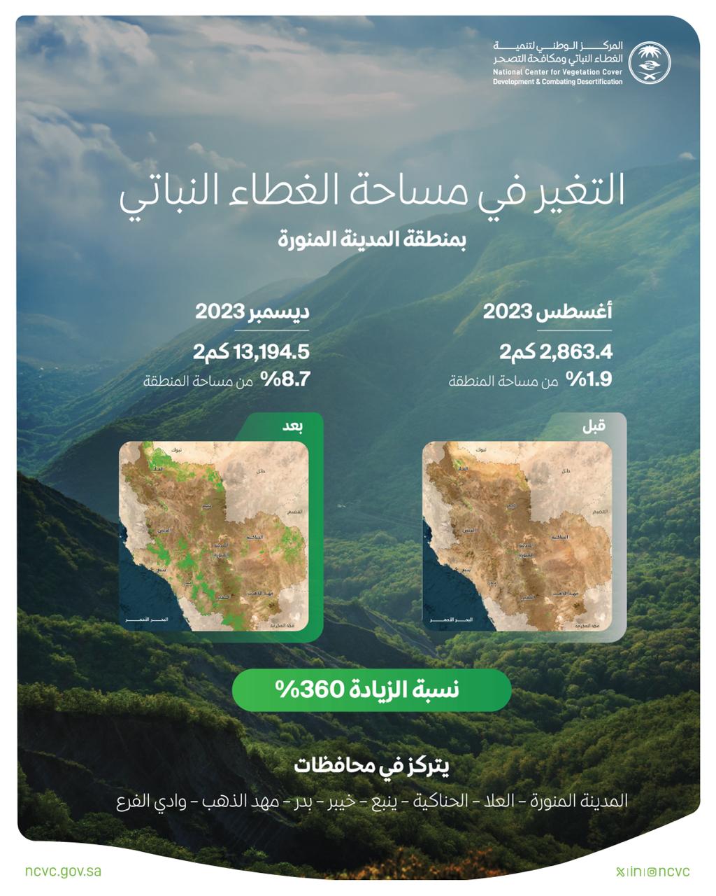 وأوضح المركز أن تحليلات بيانات الاستشعار عن بعد، كشفت عن وصول إجمالي مساحة الغطاء النباتي في المدينة المنورة في شهر أغسطس 2023م إلى 2863.4 كيلومتر مربع بما يمثل 1.9 % من إجمالي مساحة المنطقة، لتزيد المساحة تدريجيًّا خلال الأشهر التالية مع زيادة هطول الأمطار، حتى سجل المركز في نهاية شهر ديسمبر من 2023م وصول مساحة الغطاء النباتي لنحو 13,194.5 كيلومتر تغطي 8.7 % من إجمالي مساحة المنطقة.