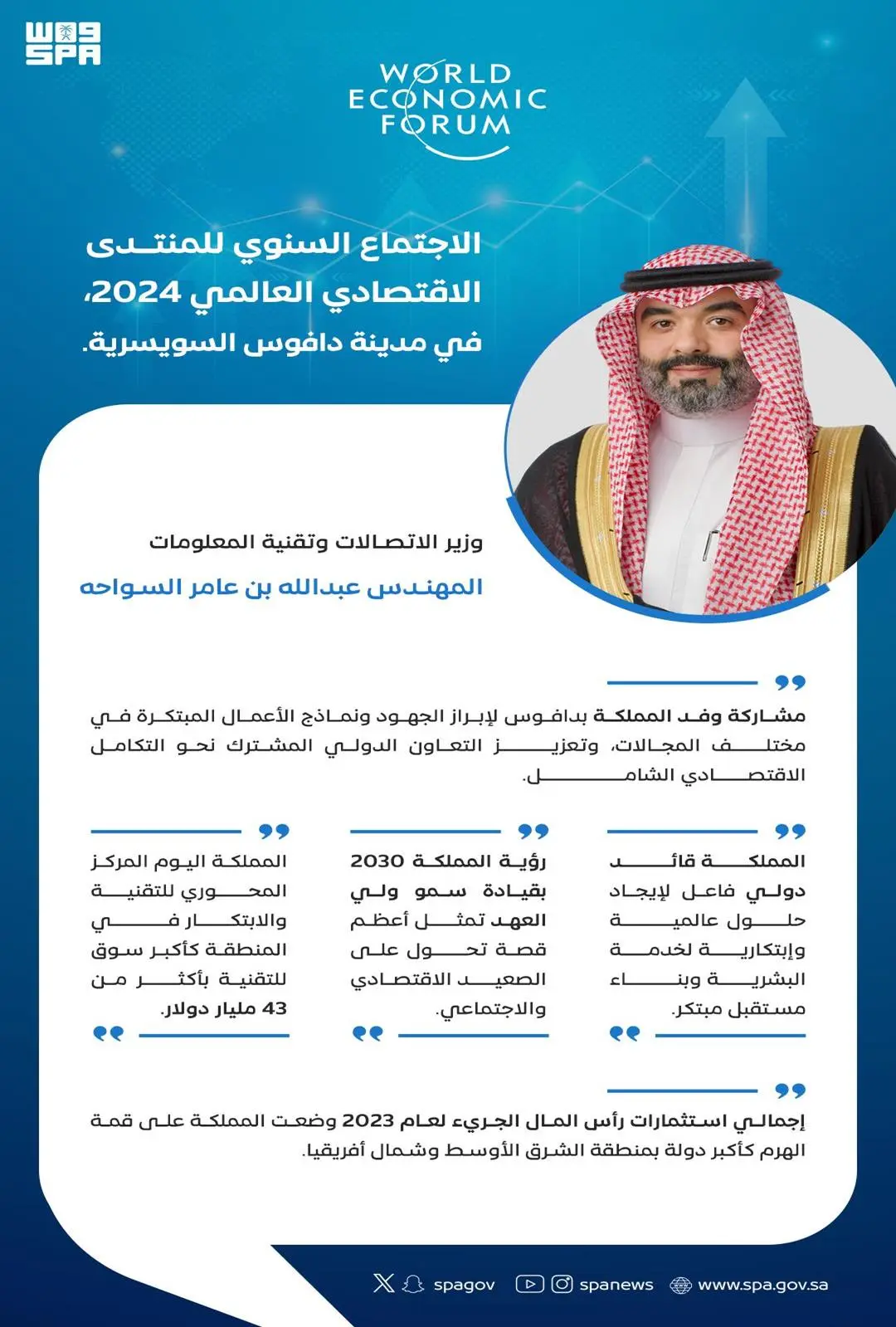وقال السواحه في تصريح لوكالة الأنباء السعودية تحضيرًا لمشاركة وفد المملكة في اجتماعات المنتدى الاقتصادي العالمي بدافوس السويسرية خلال الفترة 15-19 يناير الحالي: إن رؤية المملكة 2030 بقيادة سمو ولي العهد “أيده الله” تمثل أعظم قصة تحول على الصعيد الاقتصادي والاجتماعي، مستشهداً بالتحول الذي صنعته الرؤية على مستوى الاقتصاد الرقمي الذي قاد المملكة لتكون اليوم المركز المحوري للتقنية والابتكار في المنطقة كأكبر سوق للتقنية بأكثر من 43 مليار دولار، وأكبر نقطة لتمركز المواهب والقدرات الرقمية بأكثر من 354 ألف شاب وفتاة، مع نمو نوعي في تمكين المرأة في القطاع الذي يصل اليوم إلى 35% ، متجاوزة متوسط الاتحاد الأوروبي ومجموعة العشرين ووادي السليكون.