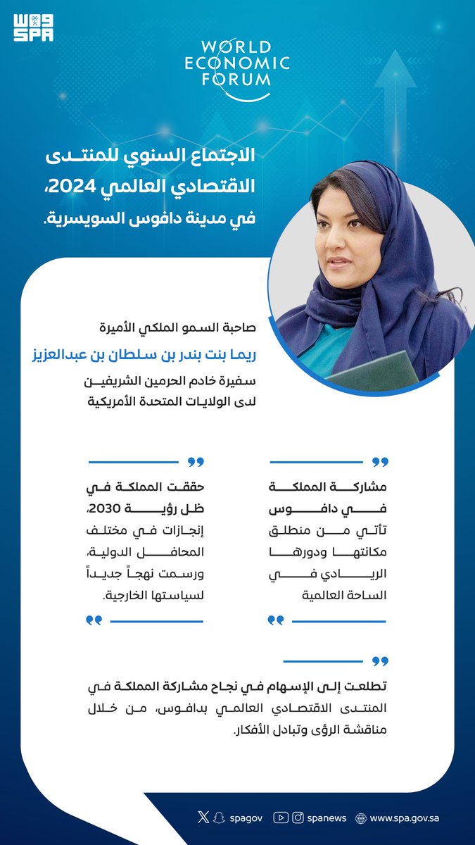 أعربت صاحبة السمو الملكي الأميرة ريما بنت بندر بن سلطان بن عبدالعزيز سفيرة خادم الحرمين الشريفين لدى الولايات المتحدة الأمريكية، عن شكرها وامتنانها لخادم الحرمين الشريفين الملك سلمان بن عبدالعزيز آل سعود، ولصاحب السمو الملكي الأمير محمد بن سلمان بن عبدالعزيز آل سعود، ولي العهد رئيس مجلس الوزراء – حفظهما الله -، على اختيارها ضمن وفد المملكة المشارك في المنتدى الاقتصادي العالمي بدافوس، تحت رئاسة سمو وزير الخارجية.