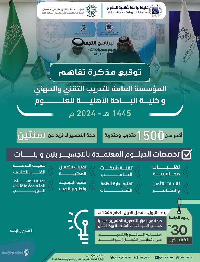 وقد وقع الاتفاقية من جانب الإدارة العامة للتدريب التقني والمهني بمنطقة الباحة مديرها العام أ. خالد بن ربيعان آل مشوط، ومن جانب كلية الباحة الأهلية للعلوم عميد الكلية الدكتور سعيد بن مشبب القحطاني.