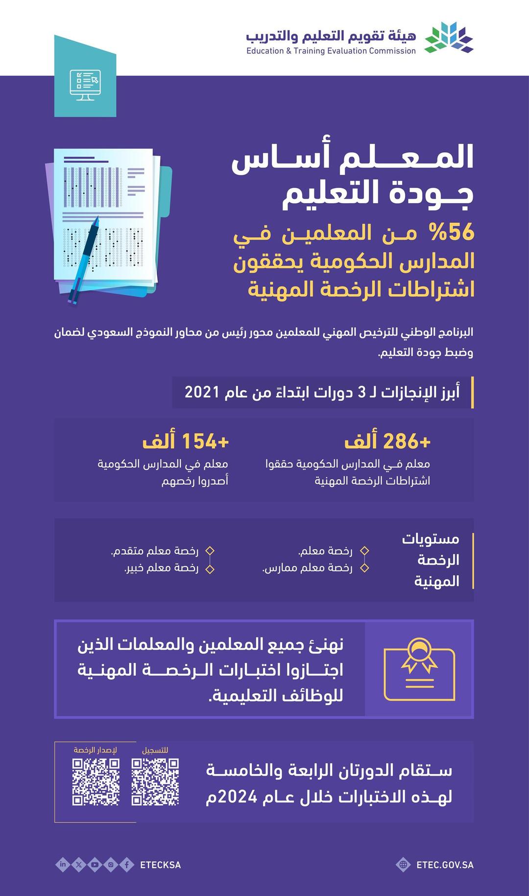 وطبقت الهيئة اختبارات الرخصة المهنية في (3) دورات ابتداءً من عام 2021م حتى 2023م، وبلغت نسبة المعلمين والمعلمات في المدارس الحكومية الذين حققوا اشتراطات الرخصة المهنية (56%)، وعددهم أكثر من 286 ألف معلم ومعلمة، بينما بلغ عدد الذين أصدروا الرخصة أكثر من 154 ألف معلم ومعلمة في المدارس الحكومية.
