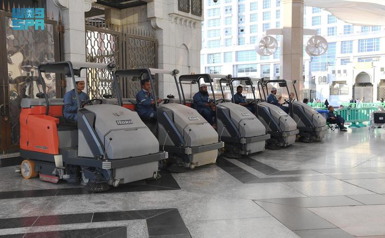 كما يتم تفعيل أجهزة الدفع الهوائي على مداخل مواقف السيارات التي تنفذ إلى الساحات، ويتبع أعمال التنظيف والتطهير تنفيذ برنامج تطييب وتبخير المسجد، وتفعيل أجهزة التعطير والتبخير الذكية ذاتية الحركة، لاستقبال حشود المصلين قبل الصلوات، في الروضة الشريفة، وعلى مداخل الأبواب، وعبر الممرات، لينعم المصلون بالروحانية والسكينة في رحاب مسجد المصطفى -صلى الله عليه وسلم- وتهيئة كافة الخدمات لرعايتهم.
