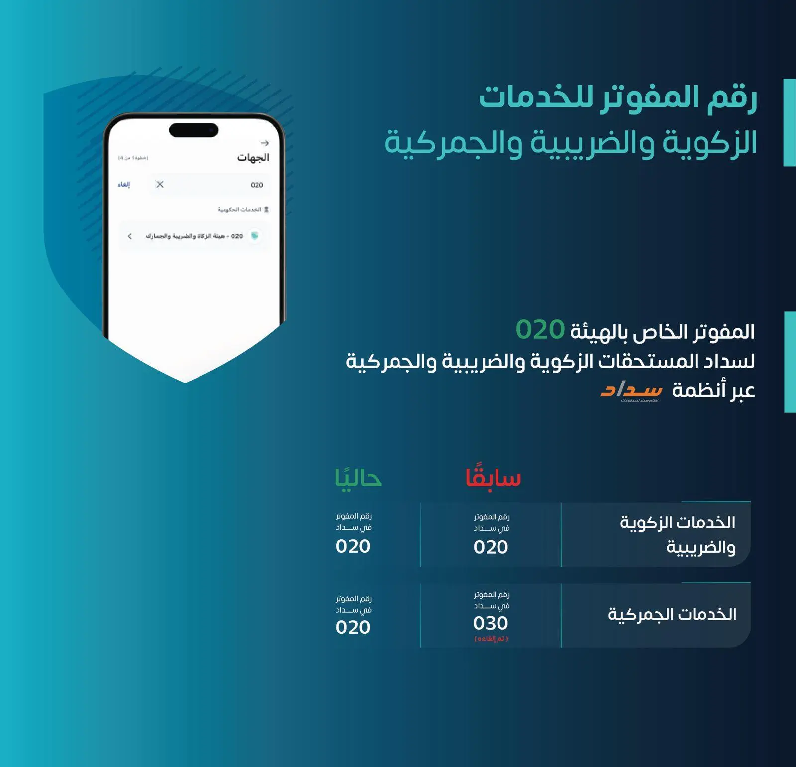 “الزكاة والضريبة والجمارك” تدعو مكلفيها وعملائها لاستخدام رقم المفوتر (020) في عمليات السداد وإلغاء التعامل بالمفوتر (030)