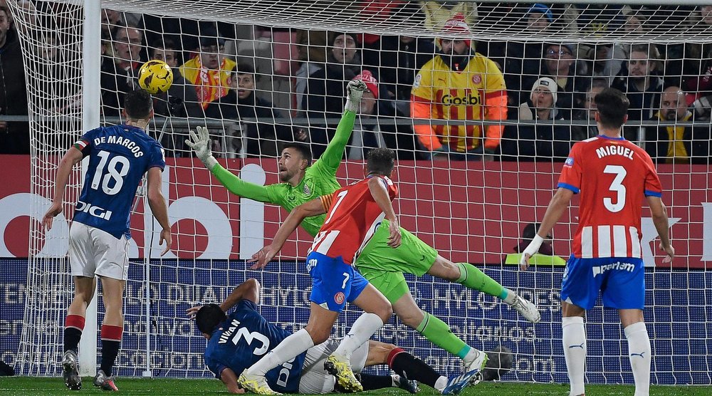 Athletic Bilbao's Spanish goalkeeper #01 Unai Simon deflects the ball during the Spanish league football match between Girona FC and Athletic Club Bilbao at the Montilivi stadium in Girona on November 27, 2023. (Photo by Josep LAGO / AFP)