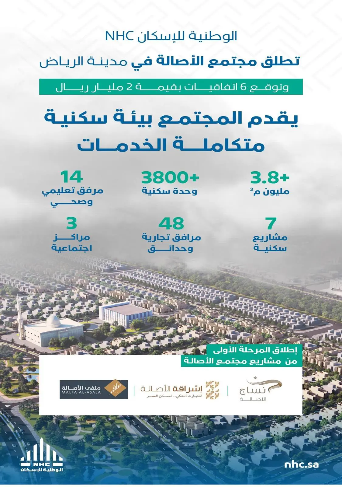 وأعلنت الشركة الوطنية للإسكان عن بدء البيع في 3 مشاريع ضمن مجتمع الأصالة، حيث يمتد المشروع الأول ” نساج تاون الأصالة” على مساحة إجمالية تصل إلى 93 ألف متر مربع، ويوفّر 366 وحدة سكنية تحت الإنشاء من نوع “فيلا” بالشراكة مع شركة رتال للتطوير العقاري.