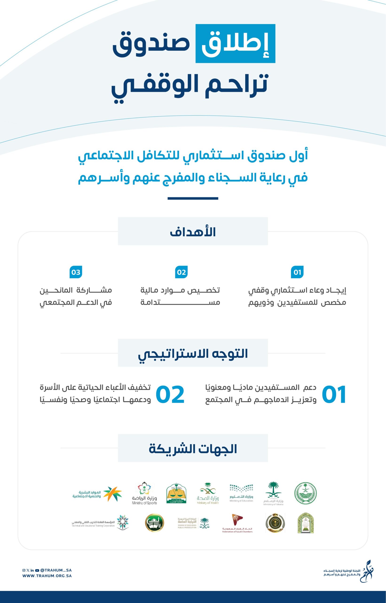 يأتي إطلاق “صندوق تراحم الوقفي” امتدادًا لجهود اللجنة الوطنية لرعاية السجناء والمفرج عنهم وأسرهم في تقديم أفضل الخدمات للمستفيدين، وتفعيل الجانب الاستثماري في الصناديق الوقفية؛ بصفته جزءًا من الدور الوطني للمواءمة بين الأهداف الاستثمارية والأهداف الإستراتيجية التنموية للجنة والقطاع غير الربحي وفق رؤية المملكة لعام 2030م.