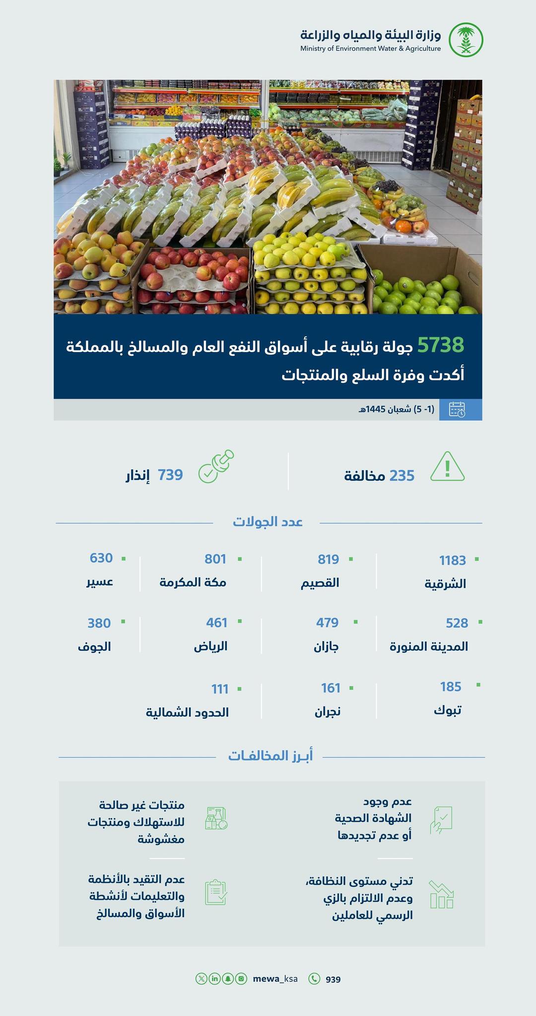 نفذت وزارة البيئة والمياه والزراعة (5738) جولة رقابية وتفتيشية على أسواق النفع العام والمسالخ؛ خلال خمسة أيام منذ بداية شهر شعبان الجاري؛ لرصد وفرة السلع والمنتجات الغذائية، والتأكد من التزام المنشآت بالأنظمة، واللوائح، والاشتراطات الصحية، والفنية.