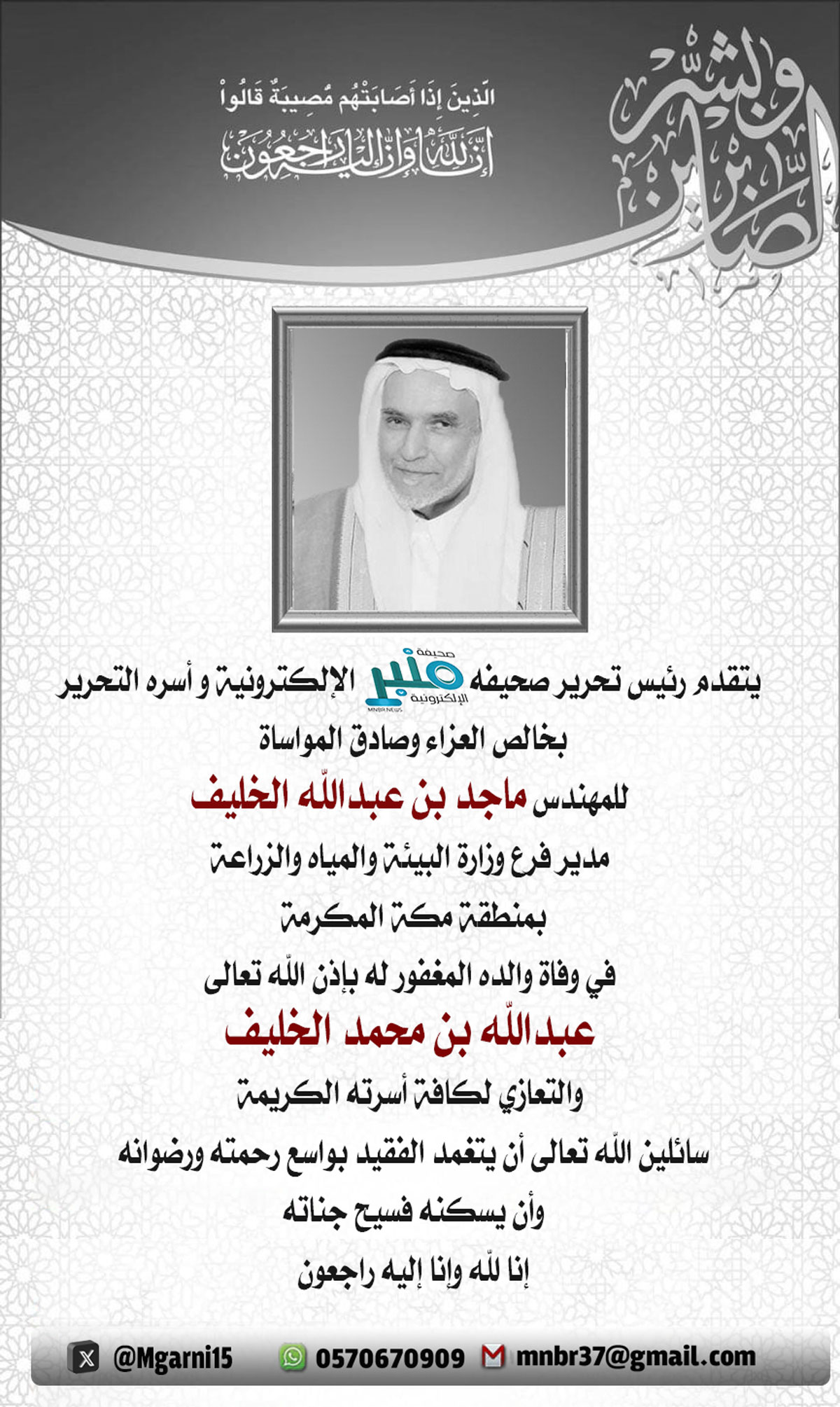 وصحيفة “منبر” الإلكترونية وقد آلمها الخبر تتقدم بخالص العزاء وصادق المواساة للمهندس “ماجد الخليف” و لكافة أسرة الفقيد، سائلين الله تعالى أن يتغمد الفقيد بواسع رحمته ورضوانه وأن يسكنه فسيح جناته .