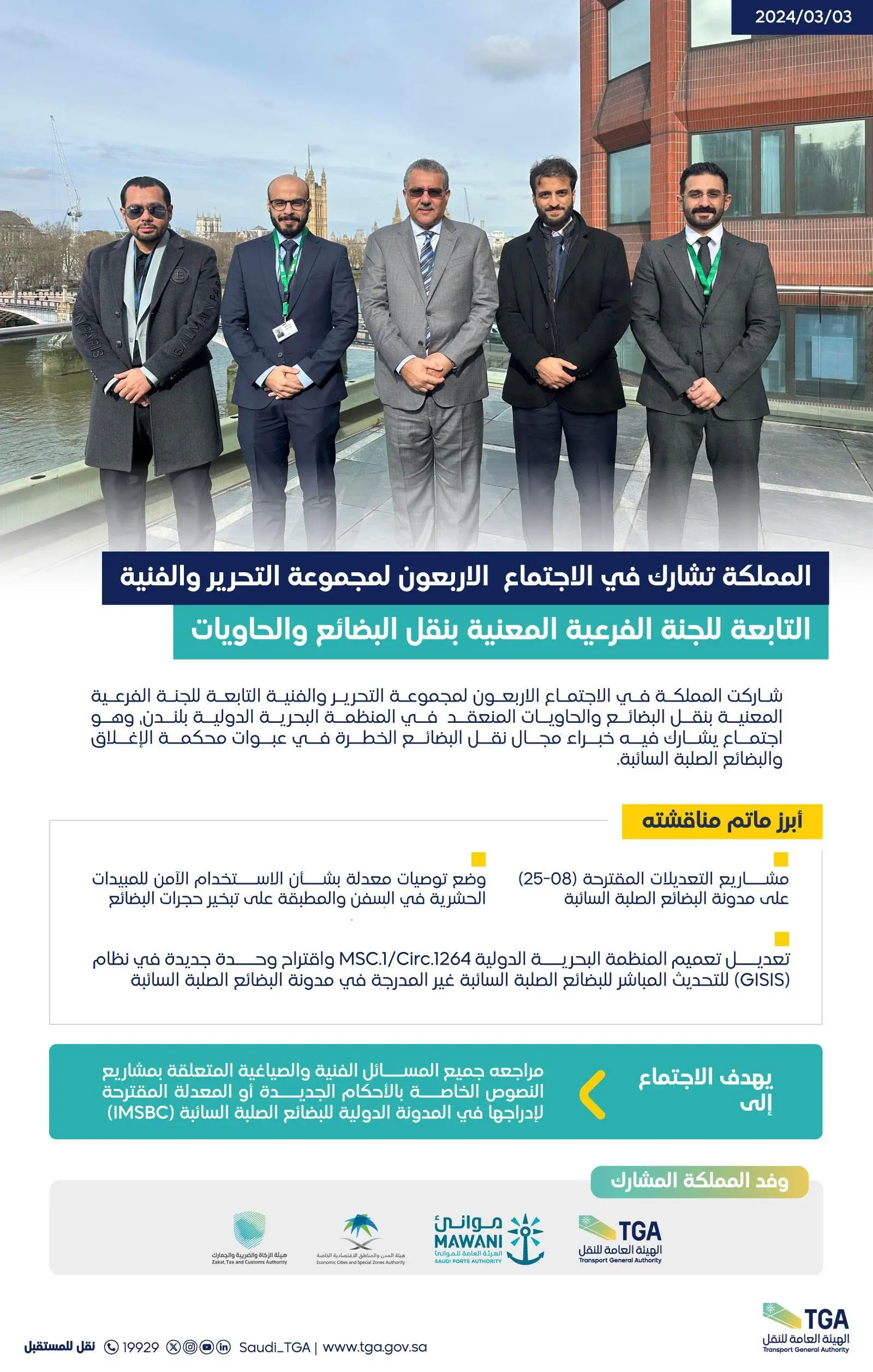شاركت المملكة في الاجتماع الأربعين لمجموعة التحرير والفنية التابعة للجنة الفرعية المعنية بنقل البضائع والحاويات المنعقد في المنظمة البحرية الدولية بلندن، وهو اجتماع يشارك فيه خبراء مجال نقل البضائع الخطرة في عبوات محكمة الإغلاق والبضائع الصلبة السائبة؛ يهدف إلى مراجعة جميع المسائل الفنية والصياغية المتعلقة بمشاريع النصوص الخاصة بالأحكام الجديدة أو المعدلة المقترحة لإدراجها في المدونة الدولية للبضائع الصلبة السائبة (IMSBC).
