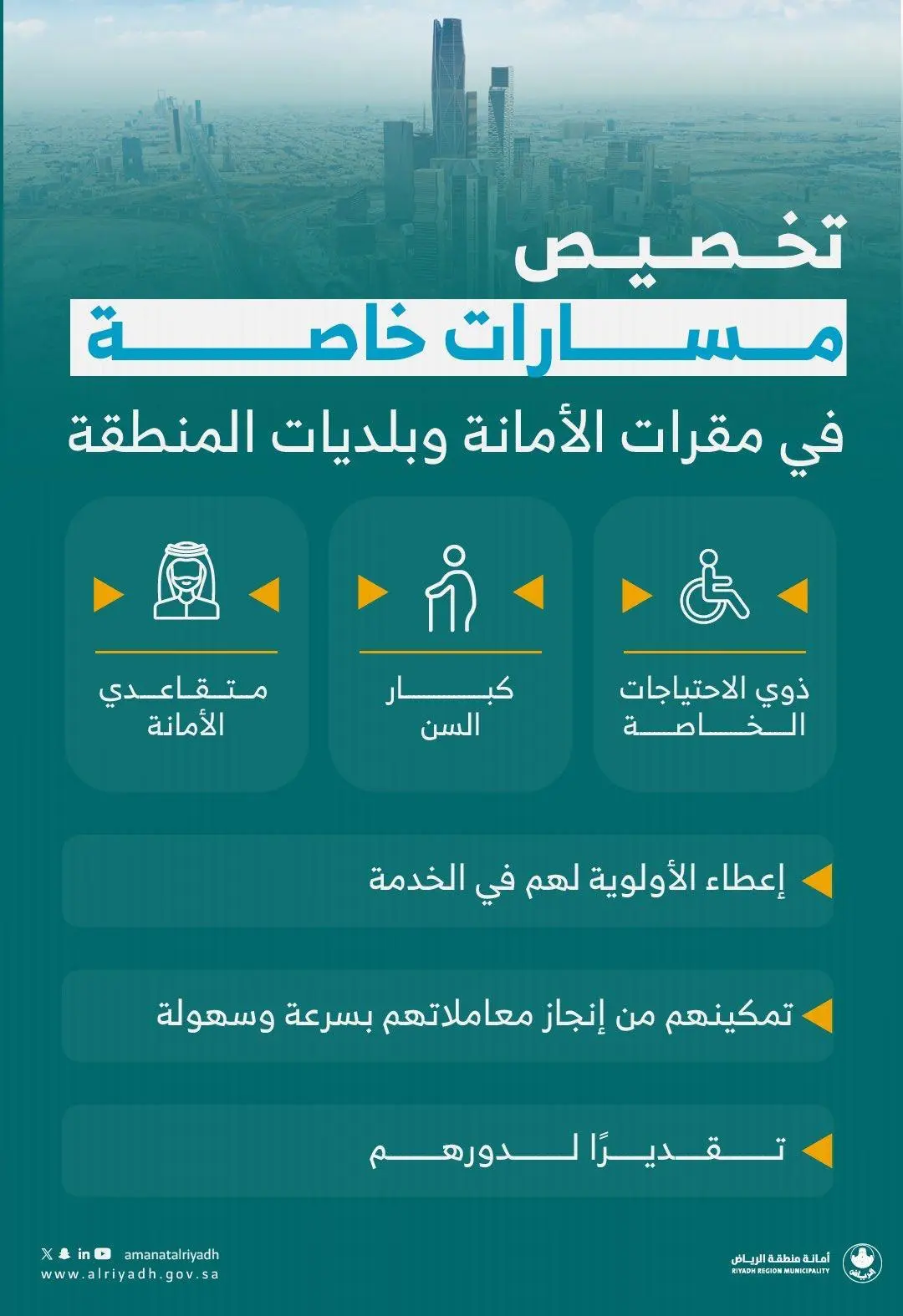 وجّه صاحب السمو الأمير الدكتور فيصل بن عبدالعزيز بن عيّاف أمين منطقة الرياض, بتخصيص مسار خاص وسريع لخدمة ذوي الإعاقة وكبار السن ومتقاعدي الأمانة، في جميع مقرات الأمانة وبلديات منطقة الرياض.