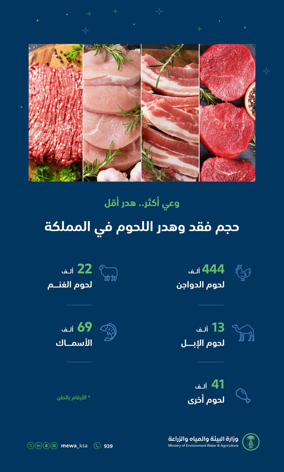 دعت وزارة البيئة والمياه والزراعة إلى تعزيز سلوك الاستهلاك الرشيد؛ للحد من فقد وهدر اللحوم في المملكة، وذلك في خطوة ضرورية وهامة ؛ للوصول للاستدامة وتحقيق الأمن الغذائي في المملكة وفق مستهدفات رؤية 2030.