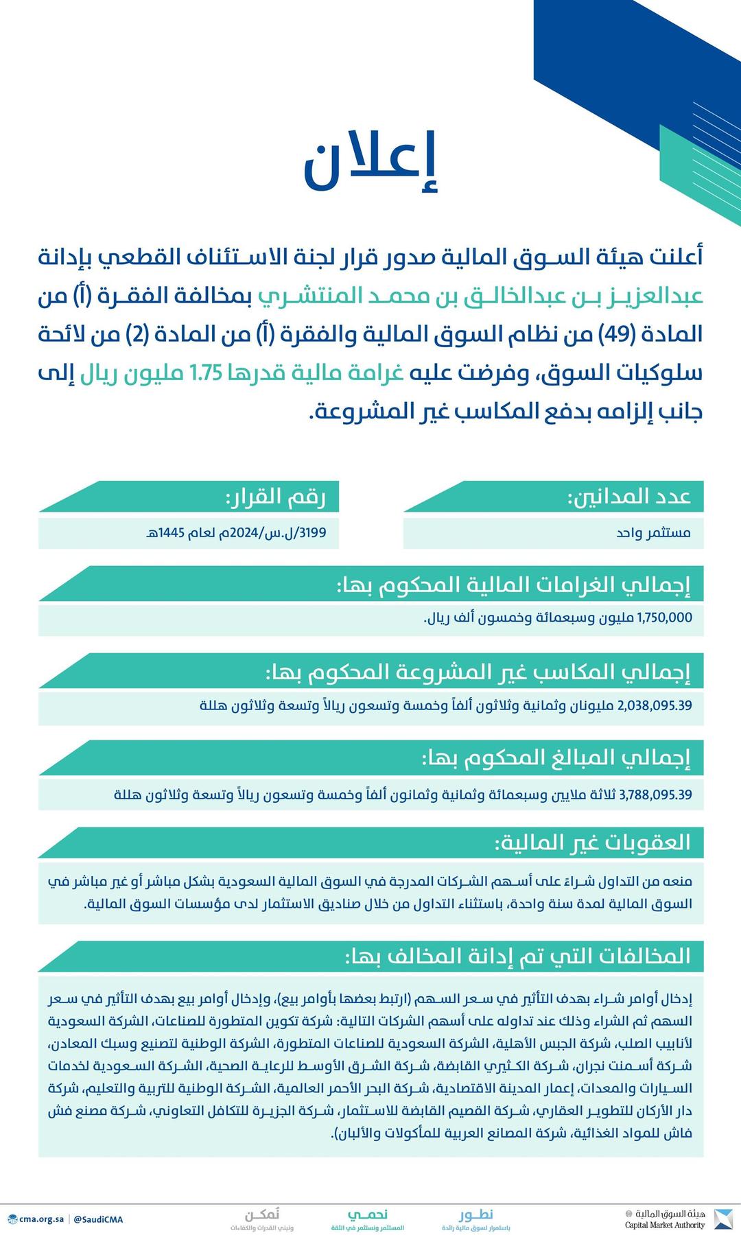 أدانت لجنة الاستئناف في منازعات الأوراق المالية , مستثمراً بمخالفة نظام السوق المالية ولوائحه التنفيذية، وفرضت عليه غرامة قدرها 1.75 مليون ريال، وألزمته بدفع 2.03 مليون ريال , نظير المكاسب غير المشروعة التي تحققت على محفظته الاستثمارية، إثر قيامه بإدخال أوامر شراء بهدف التأثير في سعر السهم (ارتبط بعضها بأوامر بيع)، وإدخال أوامر بيع بهدف التأثير في سعر السهم , ثم الشراء وذلك عند تداوله على أسهم: (شركة تكوين المتطورة للصناعات، الشركة السعودية لأنابيب الصلب، شركة الجبس الأهلية، الشركة السعودية للصناعات المتطورة، الشركة الوطنية لتصنيع وسبك المعادن، شركة أسمنت نجران، شركة الكثيري القابضة، شركة الشرق الأوسط للرعاية الصحية، الشركة السعودية لخدمات السيارات والمعدات، إعمار المدينة الاقتصادية، شركة البحر الأحمر العالمية، الشركة الوطنية للتربية والتعليم، شركة دار الأركان للتطوير العقاري، شركة القصيم القابضة للاستثمار، شركة الجزيرة للتكافل التعاوني، شركة مصنع فش فاش للمواد الغذائية، شركة المصانع العربية للمأكولات والألبان)، وذلك خلال الفترة من تاريخ 13 / 08 / 2020 م وحتى تاريخ 15 / 06 / 2022 م.