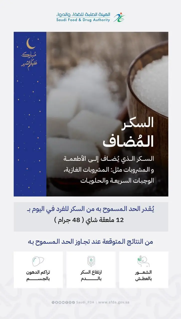 أوضحت الهيئة العامة للغذاء والدواء أن تجاوز الفرد للحد اليومي المسموح به من السكر قد يسهم في زيادة الشعور بالعطش، وارتفاع السكر بالدم، وتراكم الدهون في الجسم.
