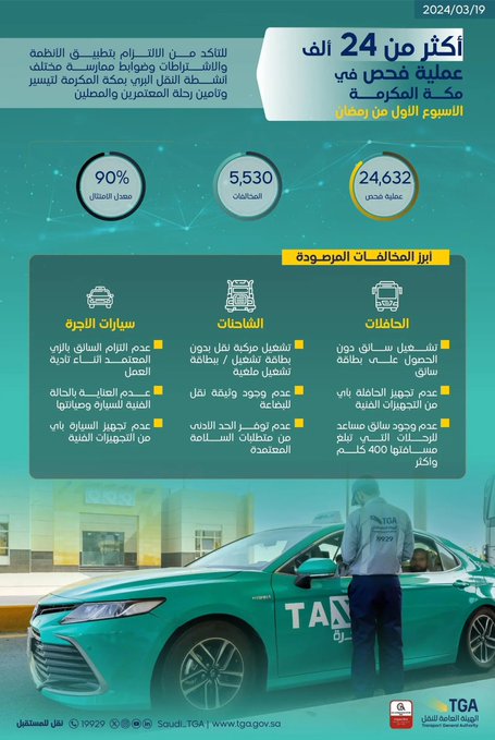 نفذت الهيئة العامة للنقل أكثر من 34 ألف عملية فحص في مكة المكرمة والمدينة المنورة خلال الأسبوع الأول من شهر رمضان، وذلك في إطار جهودها المستمرة لتعزيز الالتزام بالمعايير والأنظمة وضمان سلامة ضيوف الرحمن أثناء تنقلهم.