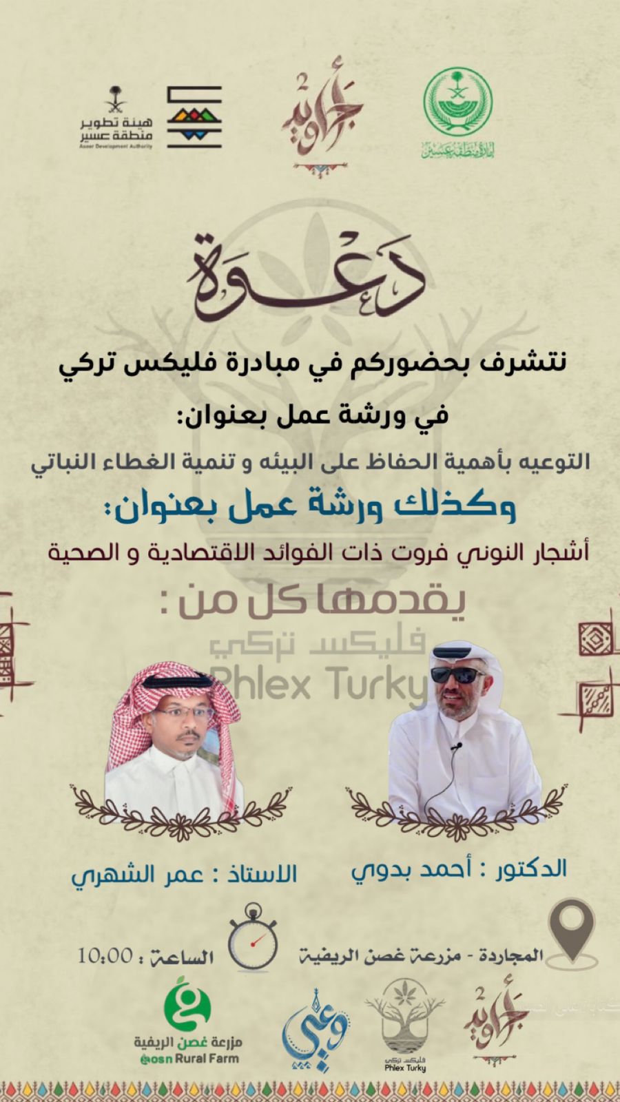 ضمن مبادرات أجاويد بمحافظة المجاردة تستمر فعاليات مبادرة (فليكس تركي ) والتي تقام في مزرعة غصن طوال شهر رمضان المبارك، وتهدف الى تعزيز الوعي الزراعي حيث سيقام مساء اليوم الأربعاء الساعة العاشرة مساءً ورشة عمل بعنوان (التوعية بأهمية الحفاظ على البيئة، وتنمية الغطاء النباتي )وكذلك ورشة عمل بعنوان (أشجار النوني فروت ذات الفوائد الاقتصادية، والصحية) والتي يقدمها الناشط البيئي الدكتور/ أحمد بدوي وبمعيته مالك مزرعة غصن الأستاذ/ عمر محمد الشهري علماً أن الدعوة للجميع بالمشاركة والإستفادة من مثل هذه الورش، والمبادرات النوعية التي تخدم الزراعة، والمزارعين.