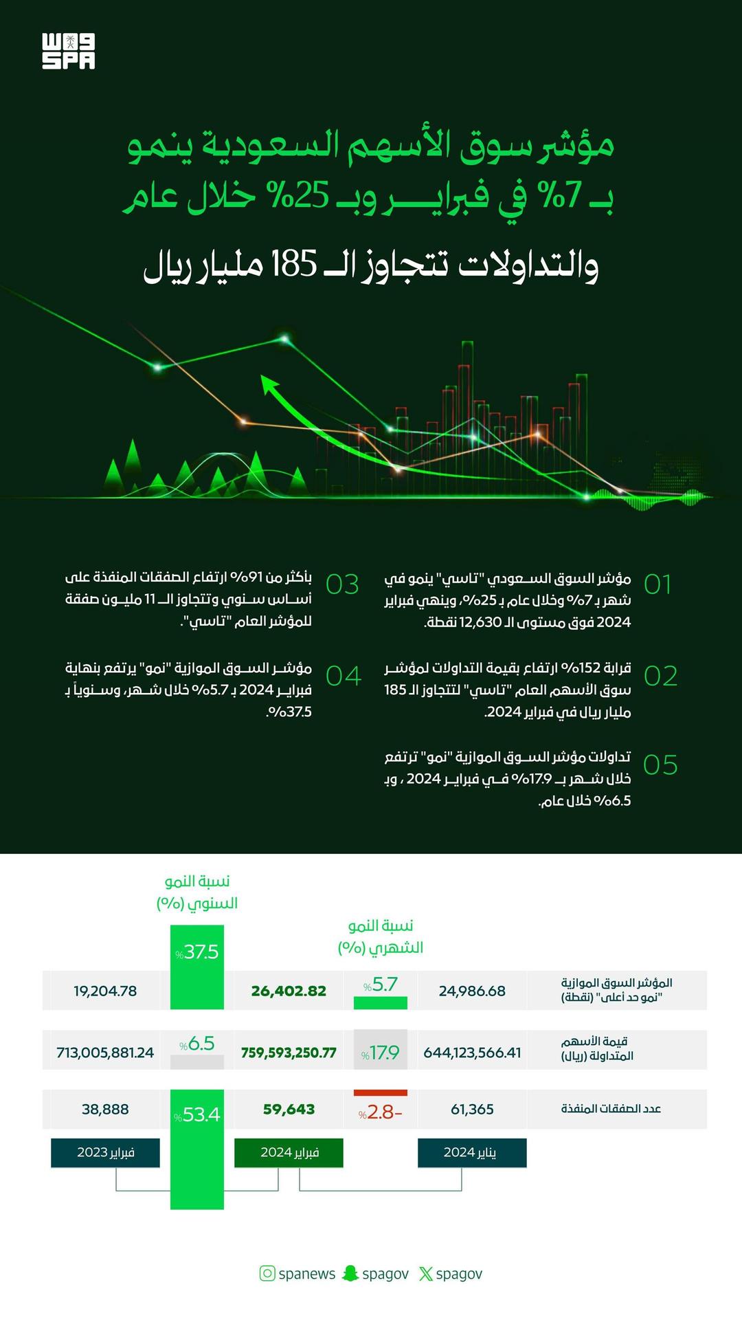 مؤشر سوق الأسهم السعودية ينمو 7% في فبراير و 25% خلال عام.. والتداولات تتجاوز الـ 185 مليار ريال