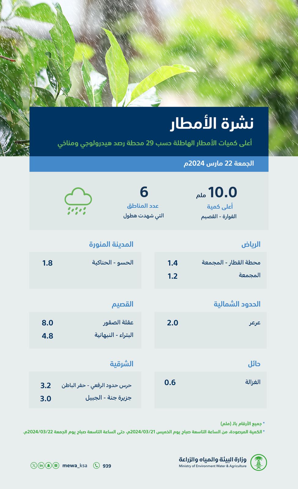 ووفقًا للتقرير اليومي لوزارة البيئة والمياه والزراعة حول رصد كميات هطول الأمطار في مناطق المملكة كافة؛ رصدت (29) محطة رصد هيدرولوجي ومناخي، خلال الفترة من الساعة التاسعة صباح الخميس 21 مارس، وحتى التاسعة صباح الجمعة 22 مارس2024؛ هطول أمطارٍ في مناطق (الرياض، المدينة المنورة، القصيم، الشرقية، حائل، الحدود الشمالية).