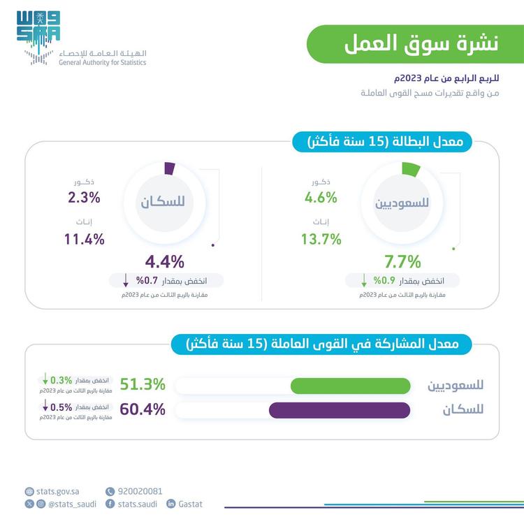 وأفادت نتائج نشرة سوق العمل للربع الثالث من عام 2023م انخفاض معدل المشاركة في القوى العاملة للسعوديات للربع الرابع من عام 2023م حيث بلغ 35.5% مقارنةً بـالربع السابق، وانخفض معدل المشاركة في القوى العاملة للسعوديين الذكور للربع الرابع من عام 2023م حيث بلغ 66.6% مقارنةً بـ 66.8% في الربع السابق.