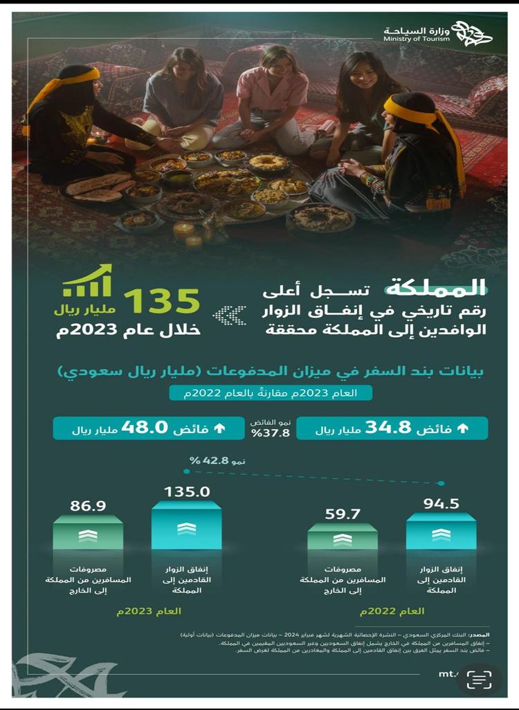 حققت المملكة العربية السعودية رقمًا قياسيًا جديدًا في إنفاق الزوار القادمين إلى المملكة من الخارج خلال العام 2023م، وذلك حسب بيانات البنك المركزي السعودي الأولية الخاصة ببند السفر في ميزان المدفوعات بإنفاق يصل إلى 135 مليار ريال، ويعد هذا الرقم هو الأعلى في تاريخ المملكة، فيما يتعلق بإنفاق الزوار القادمين من الخارج، ويمثل هذا الإنفاق نسبة نمو قدرها 42.8% مقارنة بعام 2022م.