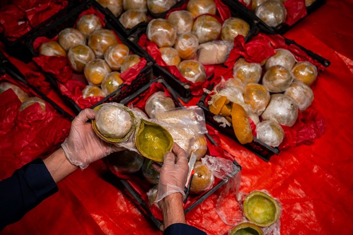 وأوضحت الهيئة أنه عند إجراء عملية الكشف والمعاينة لإحدى الشاحنات القادمة عبر المنفذ، عُثر على تلك الكمية من الحبوب مخبأة داخل إرسالية شمام، وذلك بإخفاء الحبوب في تجويف ثمار الشمام، وتغليفها.