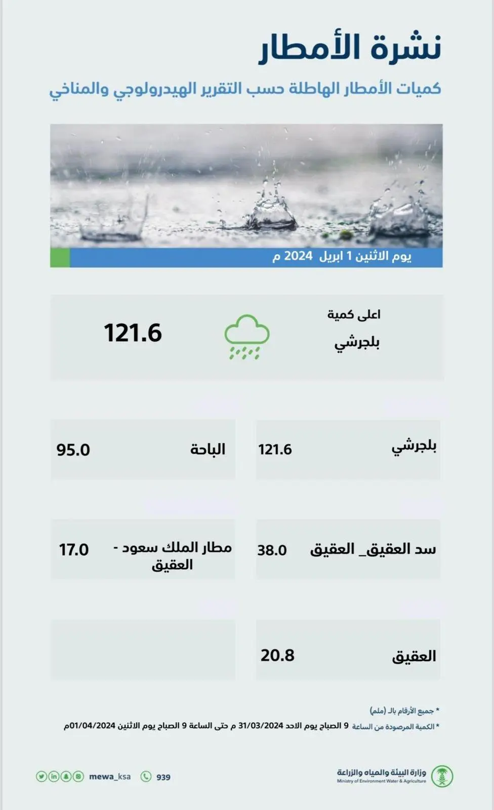 بلغت كميات الأمطار التي هطلت على منطقة الباحة يوم أمس على النحو التالي : محافظة بلجرشي 121 ملم، ومدينة الباحة 95 ملم، وسد محافظة العقيق 38 ملم.