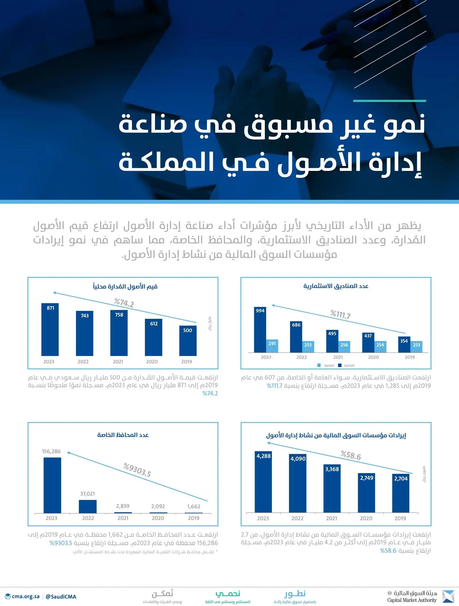 وأشار بن غنام إلى أن قيم الأصول المُدارة محلياً ارتفعت من 500 مليار ريال في عام 2019م إلى 871 مليار ريال في عام 2023م مُرتفعة بنسبة 74.2%، منوهاً إلى أن هذا الارتفاع الكبير يعود إلى ارتفاع تصاعدي في قيم أصول الصناديق والمحافظ الخاصة، إضافة إلى نمو متسارع في عدد المحافظ الخاصة والتي ارتفعت بشكل قياسي أيضاً بعد أن تجاوزت 156 ألف محفظة بنهاية عام 2023م مقابل 1662 محفظة في عام 2019م، وبارتفاع نسبته 9304%.