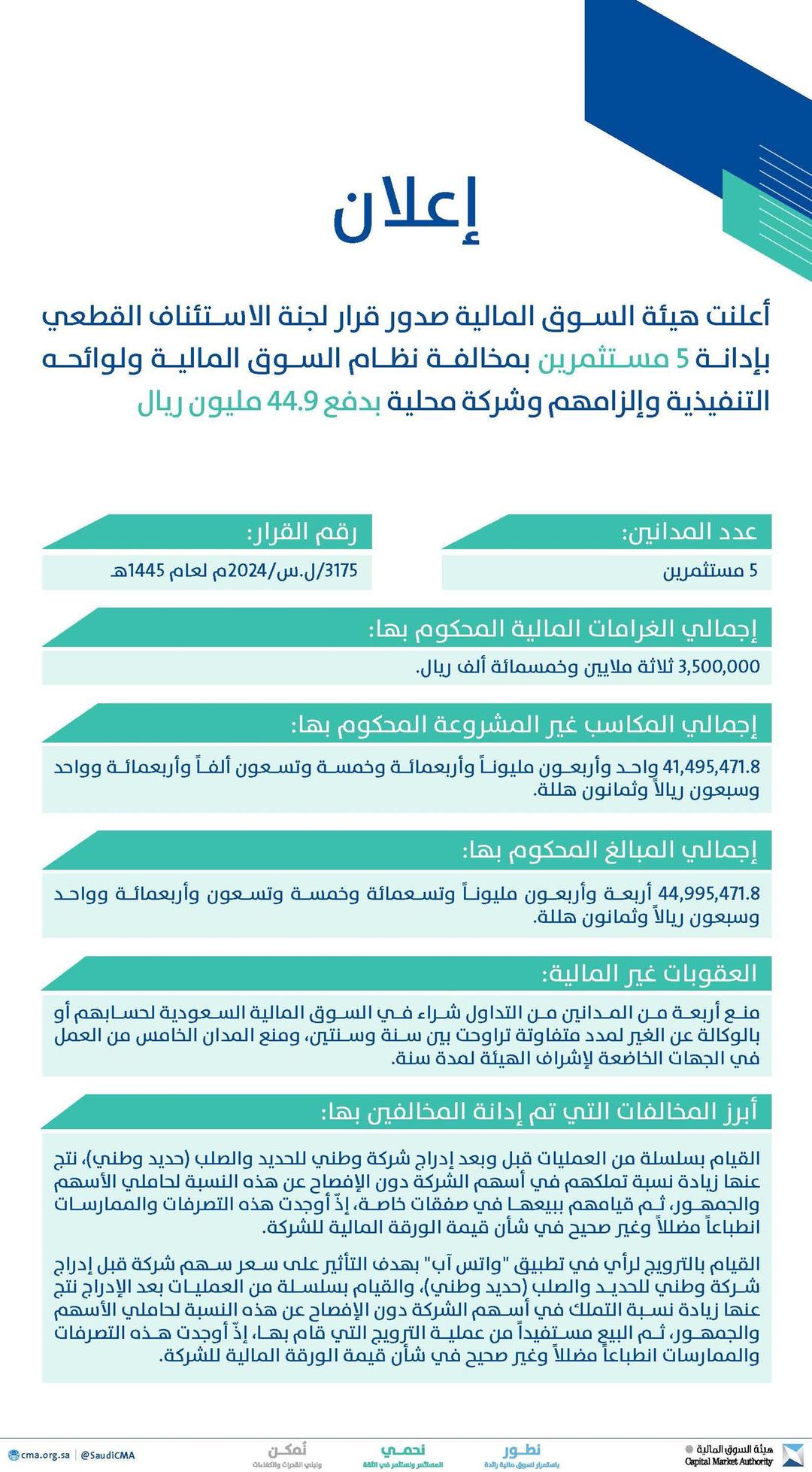 أدانت لجنة الاستئناف في منازعات الأوراق المالية , خمسة مستثمرين بمخالفة نظام السوق المالية ولوائحه التنفيذية، وغرمتهم 3.5 ملايين ريال، وألزمت أربعة منهم وشركة محلية بدفع 41.4 مليون ريال نظير المكاسب غير المشروعة التي تحققت على محافظهم الاستثمارية، إلى جانب محفظة أخرى عائدة إلى شركة مملوكة لأحدهم، إثر قيامهم بالتلاعب والتضليل أثناء قيام أربعة منهم بإجراء سلسلة من العمليات قبل وبعد إدراج شركة وطني للحديد والصلب (حديد وطني) نتج عنها زيادة نسبة تملكهم في أسهم الشركة دون الإفصاح عن هذه النسبة لحاملي الأسهم والجمهور، وقيام المدان الخامس بالترويج لرأي في مجموعتين في برنامج التواصل الاجتماعي (واتس آب) بهدف التأثير على سعر سهم الشركة ومن ثم قيامه بالبيع والاستفادة من ارتفاع سعر السهم الناتج من ترويجه للسهم.