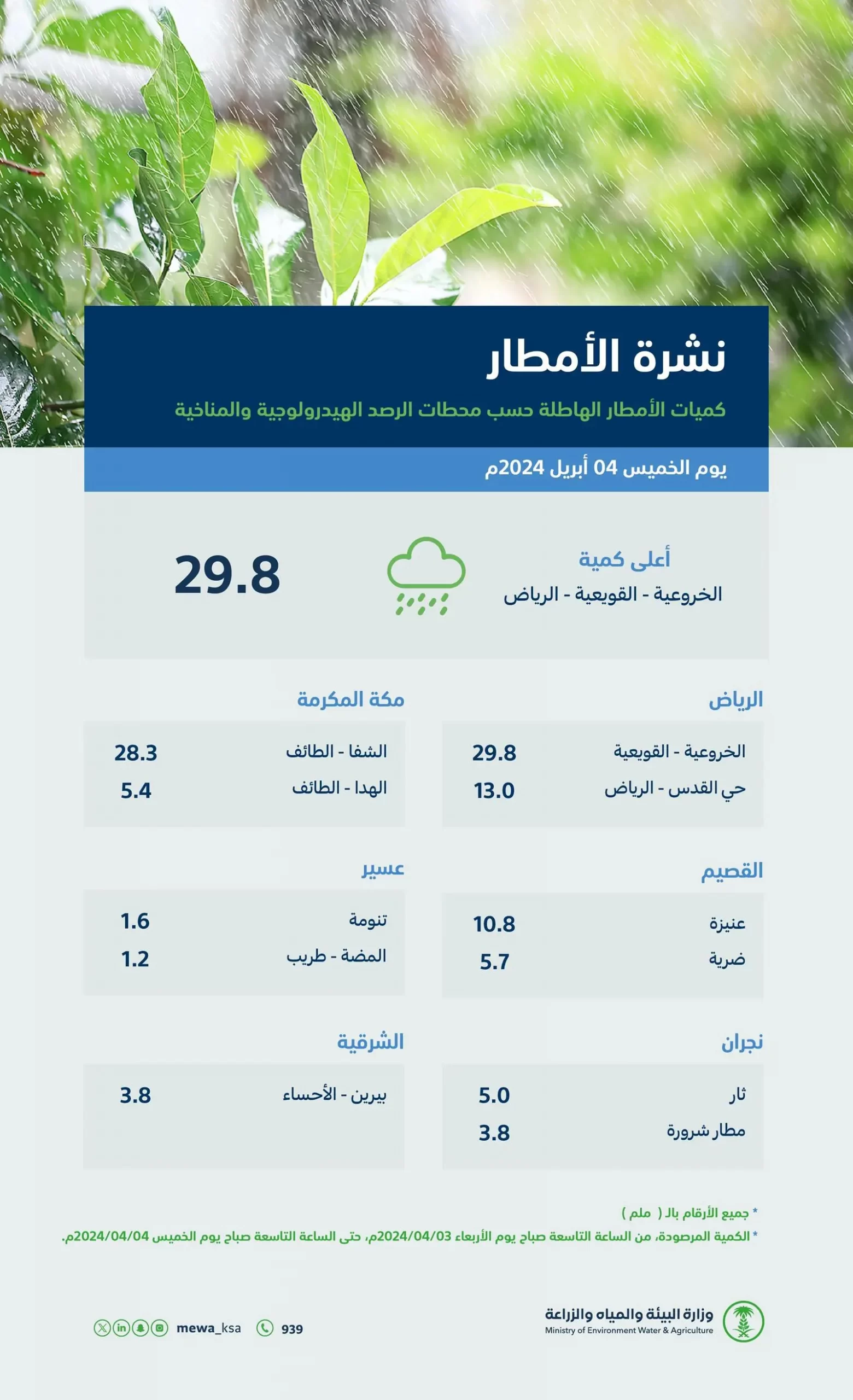 ووفقًا للتقرير اليومي لوزارة البيئة والمياه والزراعة الذي يرصد كميات هطول الأمطار في مناطق المملكة كافة، رصدت (40) محطة رصد هيدرولوجي ومناخي من الساعة التاسعة صباحًا يوم الأربعاء 03 أبريل حتى الساعة التاسعة صباحًا يوم الخميس 04 أبريل 2024، هطول أمطار في مناطق: (الرياض، مكة المكرمة، القصيم، الشرقية، عسير، نجران).