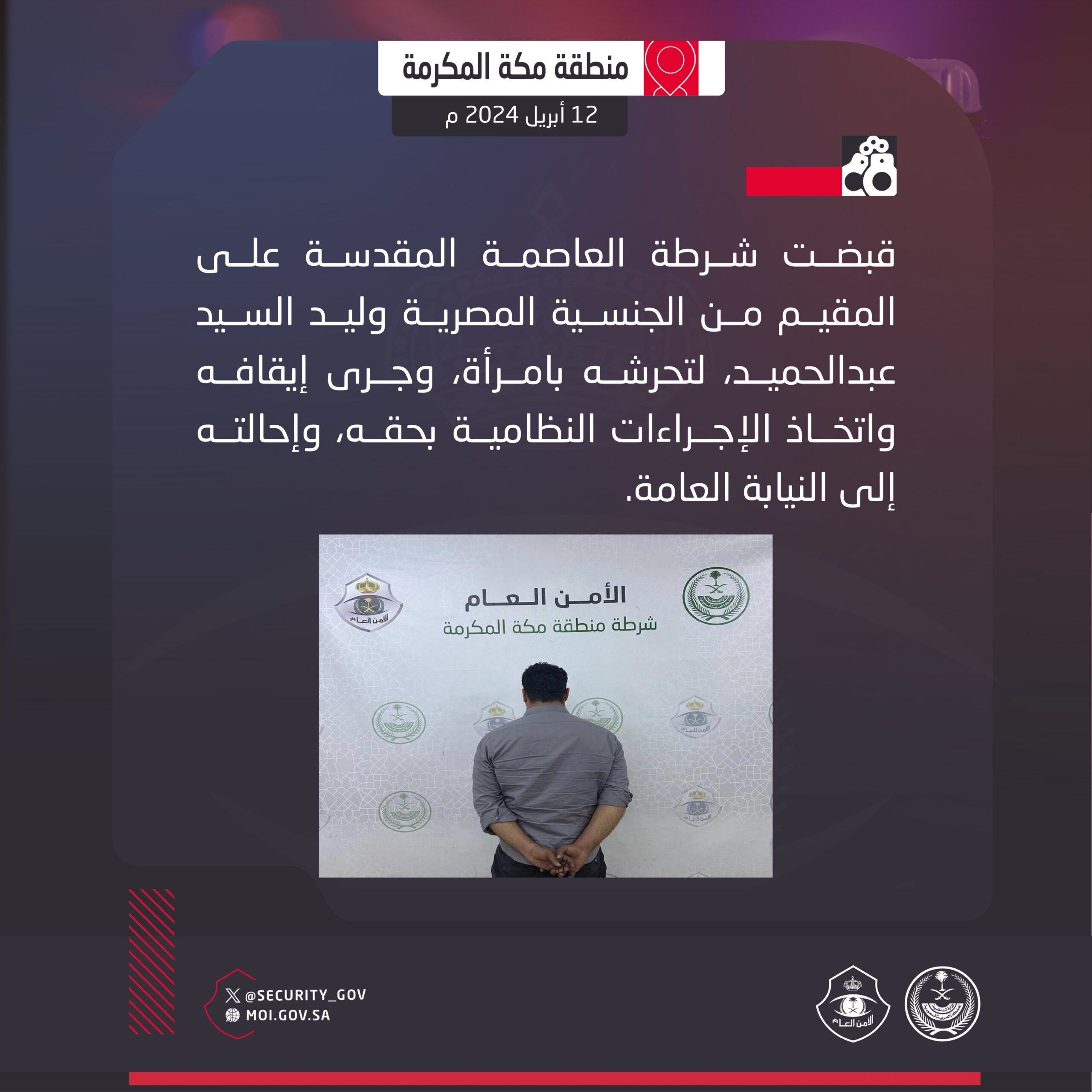 قبضت شرطة العاصمة المقدسة في مكة المكرمة، على المقيم من الجنسية المصرية يدعى “وليد السيد عبد الحميد” لتحرشه بامرأة، وجرى إيقافه واتخاذ الإجراءات النظامية بحقه، وإحالته إلى النيابة العامة.