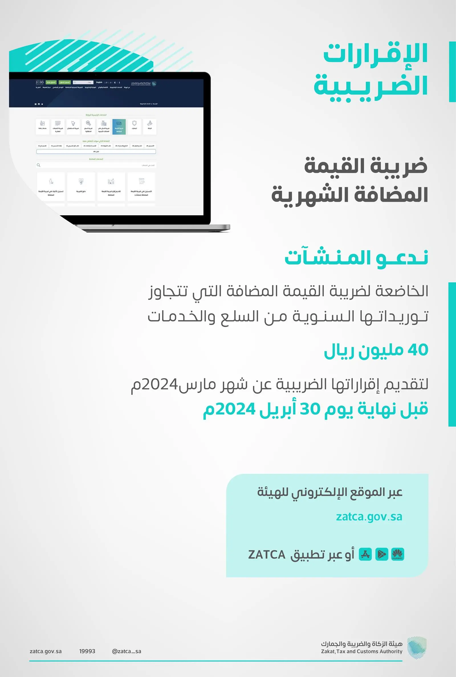 الزكاة والضريبة والجمارك تدعو المنشآت إلى تقديم إقرارات ضريبة القيمة المضافة عن شهر مارس والربع الأول لعام 2024م
