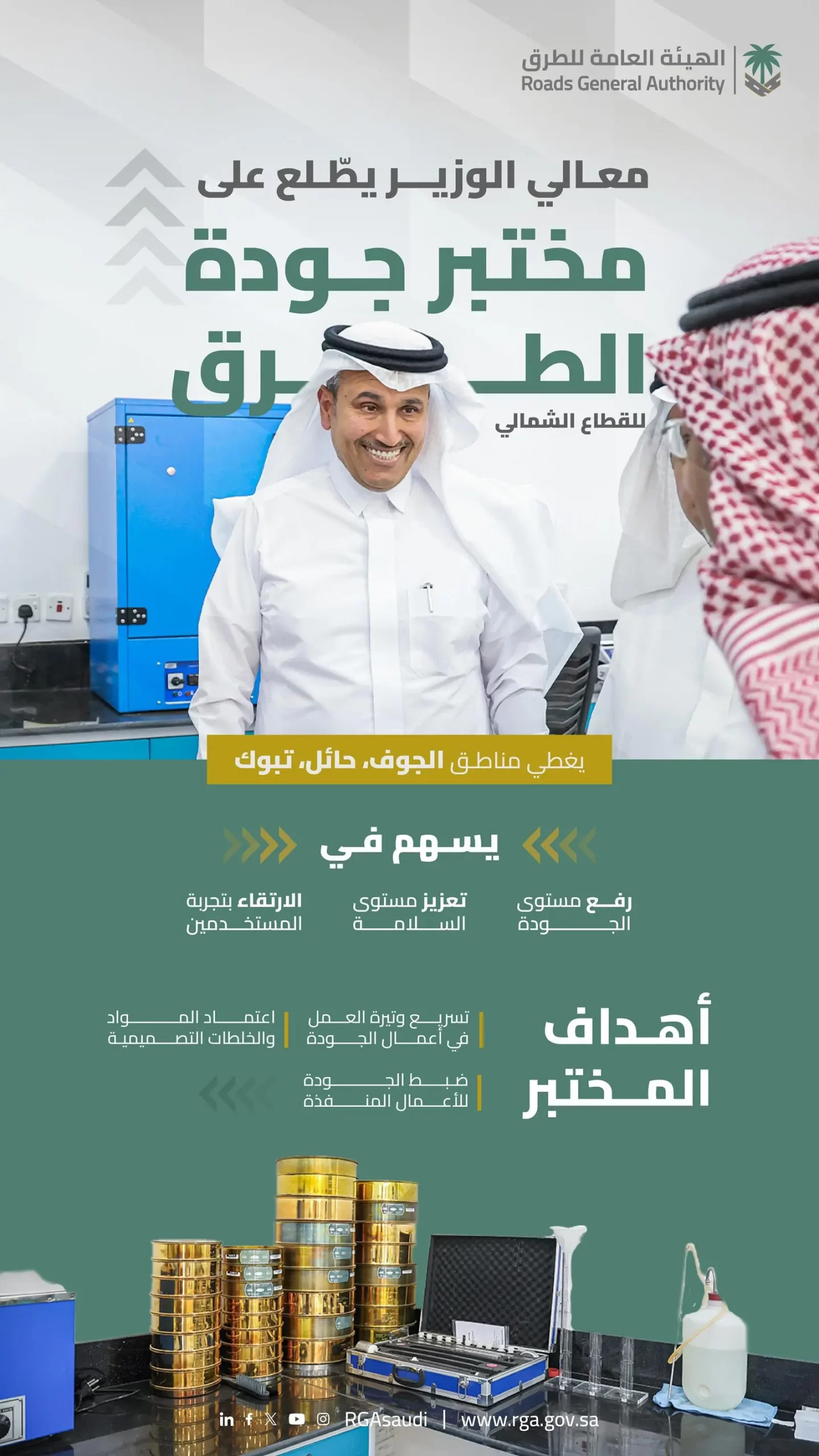 تفقد معالي وزير النقل والخدمات اللوجستية رئيس مجلس إدارة الهيئة العامة للطرق المهندس صالح بن ناصر الجاسر، برفقة معالي الرئيس التنفيذي المكلف للهيئة العامة للطرق المهندس بدر بن عبدالله الدلامي، مختبر جودة الطرق بالقطاع الشمالي.