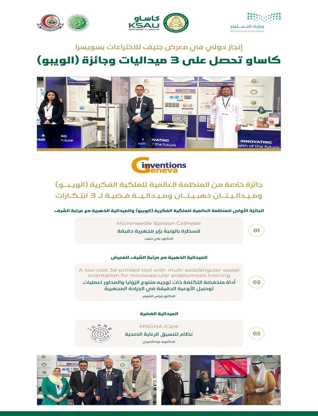 حصلت جامعة الملك سعود بن عبدالعزيز للعلوم الصحية “كاساو” , على جائزة خاصة من المنظمة العالمية للملكية الفكرية الويبو “WIP” , للمرة الأولى على مستوى المملكة وثلاث ميداليات، ذهبيتان وفضية، وذلك ضمن المشاركة البحثية في معرض جنيف الدولي للاختراعات في نسخته الـ 49، الذي يعدّ أحد أهم التجمعات للمخترعين العالمين وأكبرها.
