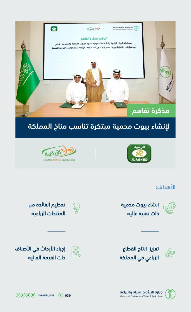 شهدت وزارة البيئة والمياه والزراعة توقيع مذكرة تفاهم بين شركة تبوك للتنمية الزراعية، والشركة السعودية لإدارة البيوت المحمية والتسويق الزراعي؛ بهدف إنشاء بيوت محمية مبتكرة ومتنوعة تتماشى مع الميز النسبية لمناطق المملكة.