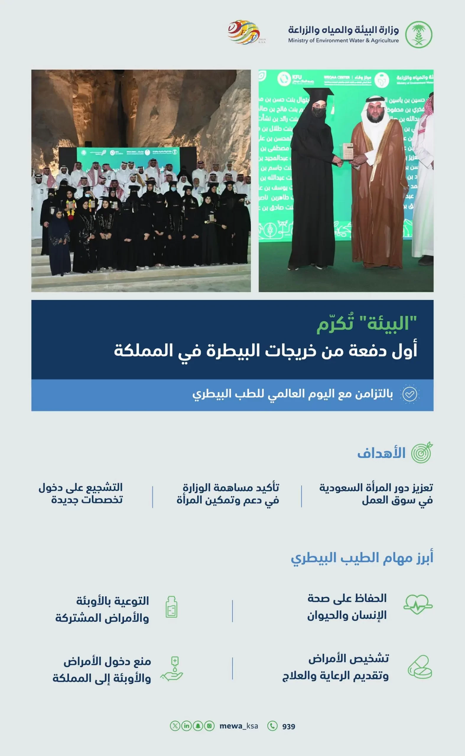 “البيئة” تُكرّم أول دفعة من خريجات البيطرة في المملكة بالتزامن مع اليوم العالمي للطب البيطري