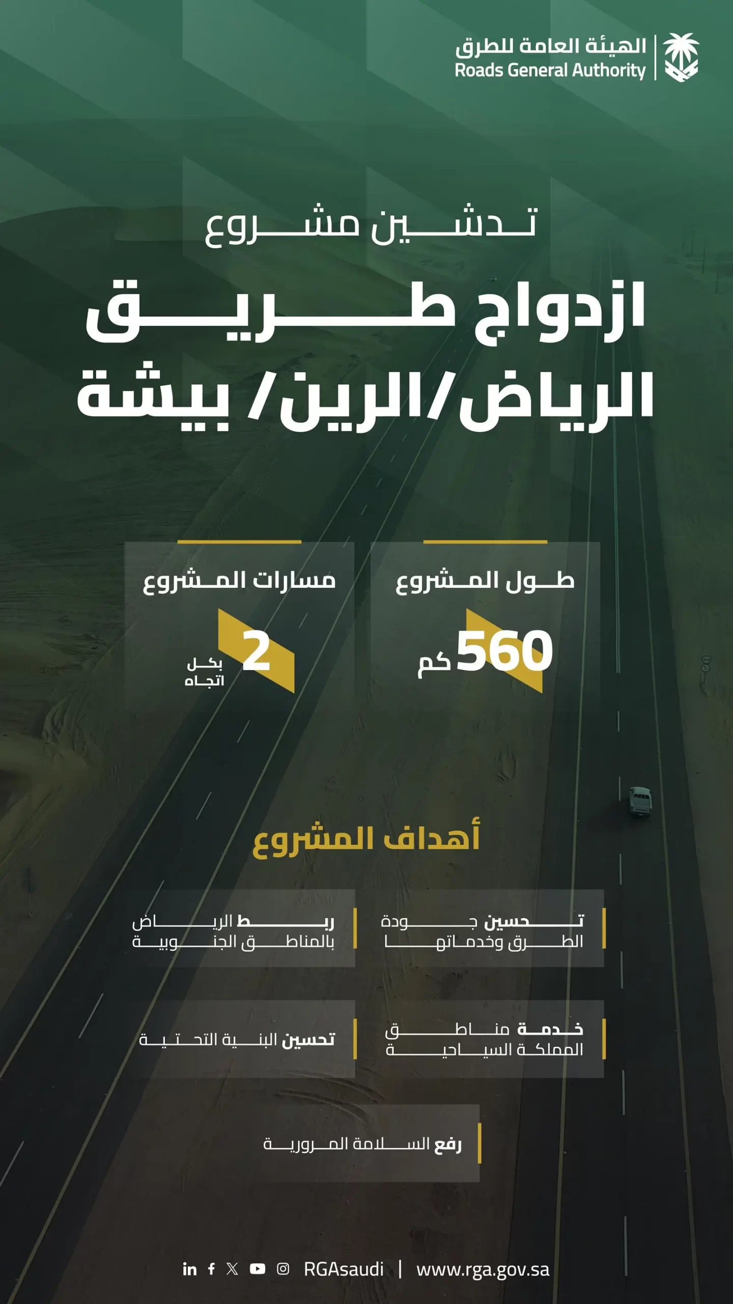 ويهدف المشروع لتحسين جودة الطرق وخدماتها، بالإضافة لدوره في ربط منطقة الرياض بالمناطق الجنوبية، كما يسهم في خدمة مناطق المملكة السياحية، وتحسين البنية التحتية للطرق، بالإضافة لدوره الحيوي والمهم في رفع مستوى السلامة.