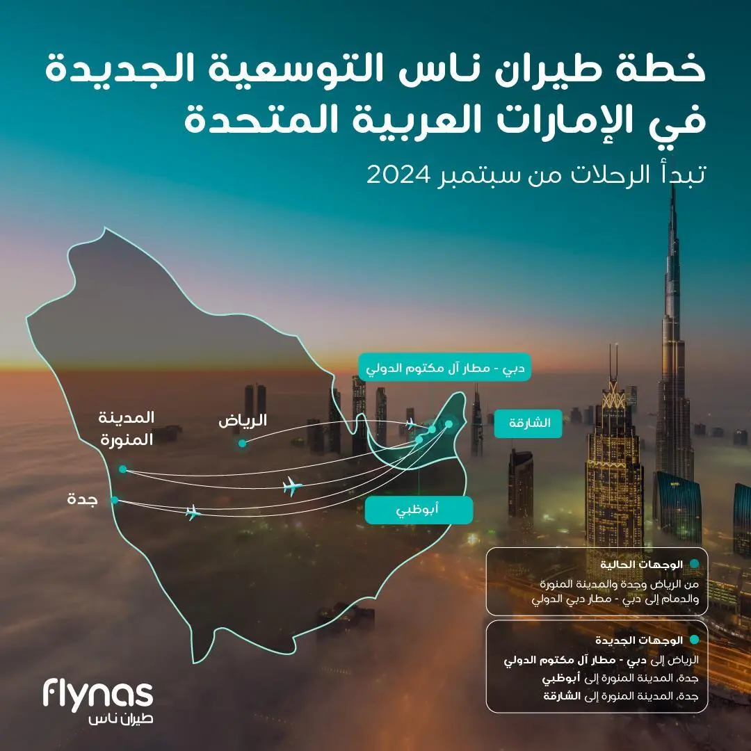 وابتداءً من سبتمبر 2024، سيصبح طيران ناس أكبر ناقل جوي بين البلدين في عدد الوجهات من خلال تشغيله رحلات إلى 4 مطارات في دولة الإمارات العربية المتحدة من 4 مدن سعودية، وبهذه الخطوة سيزيد طيران ناس عدد المسارات الجوية بين البلدين من 4 خطوط سير حالياً إلى 9 خطوط سير، رافعاً عدد الرحلات إلى أكثر من 20 رحلة يومية بين السعودية والإمارات.