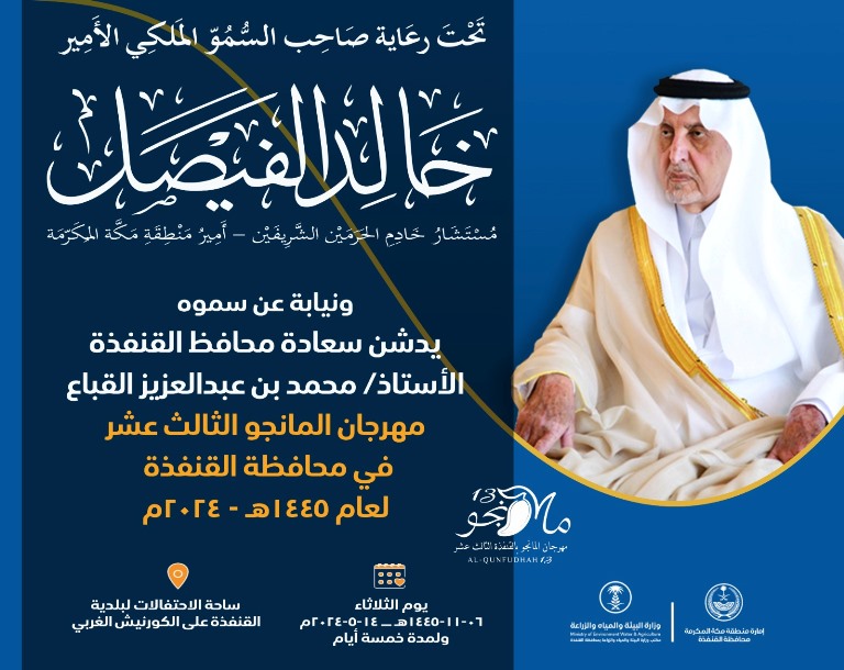 كشف مدير عام فرع وزارة البيئة والمياه والزراعة بمنطقة مكة المكرمة المهندس ماجد بن عبدالله الخليف، عن موعد انطلاق مهرجان المانجو الثالث عشر بمحافظة القنفذة، والذي ينطلق برعاية مستشار خادم الحرمين الشريفين أمير منطقة مكة المكرمة صاحب السمو الملكي الامير خالد الفيصل يوم 6 ذو القعدة 1445هـ، وسيدشنه محافظ القنفذة محمد بن عبدالعزيز القباع، ويمتد لمدة 5 أيام بساحة الاحتفالات في المركز الحضاري بالكورنيش.