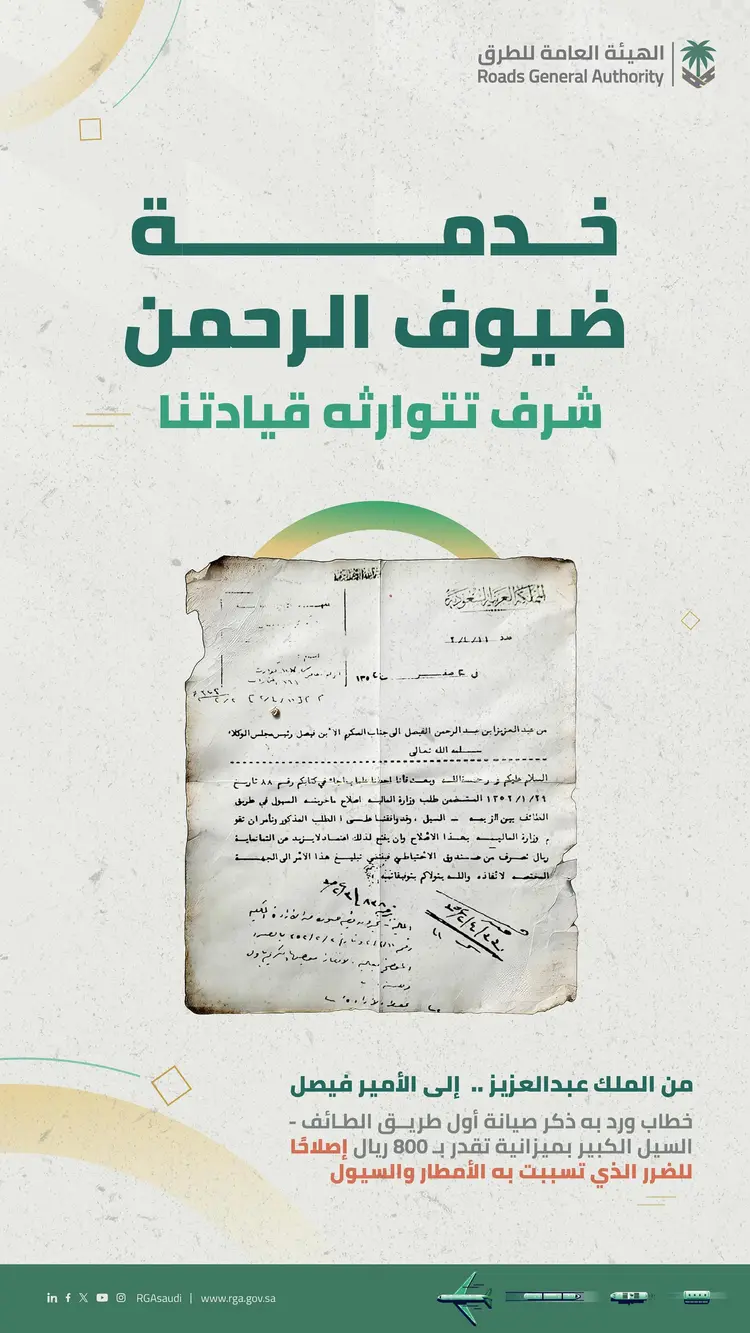 استعرضت الهيئة العامة للطرق خطابًا تاريخيًا نادرًا صادراً عن الملك عبدالعزيز آل سعود -رحمه الله-، يتضمن توجيهًا مهمًا إلى الأمير فيصل بن عبدالعزيز آل سعود -رحمه الله-، يتعلق بصيانة طريق الطائف السيل الكبير.