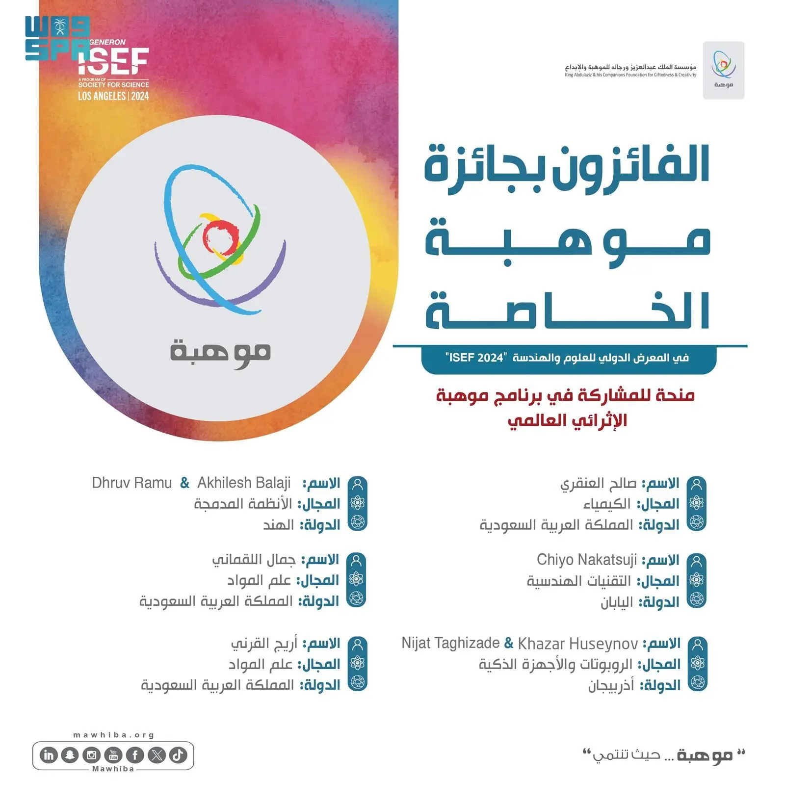 أما الطلبة الذين نالوا منحة للمشاركة في برنامج “موهبة الإثرائي العالمي، كل من؛ صالح العنقري في مجال الكيمياء، وChiyo Nakatsuji في مجال التقنيات الهندسية، و Nijat Taghizade وKhazar Huseynov في مجال الروبوتات والأجهزة الذكية، وDhruv Ramu وAkhilesh Akhilesh Balaji في مجال الأنظمة المدمجة، وجمال اللقماني في علم المواد، وأريج القرني في مجال علم المواد.