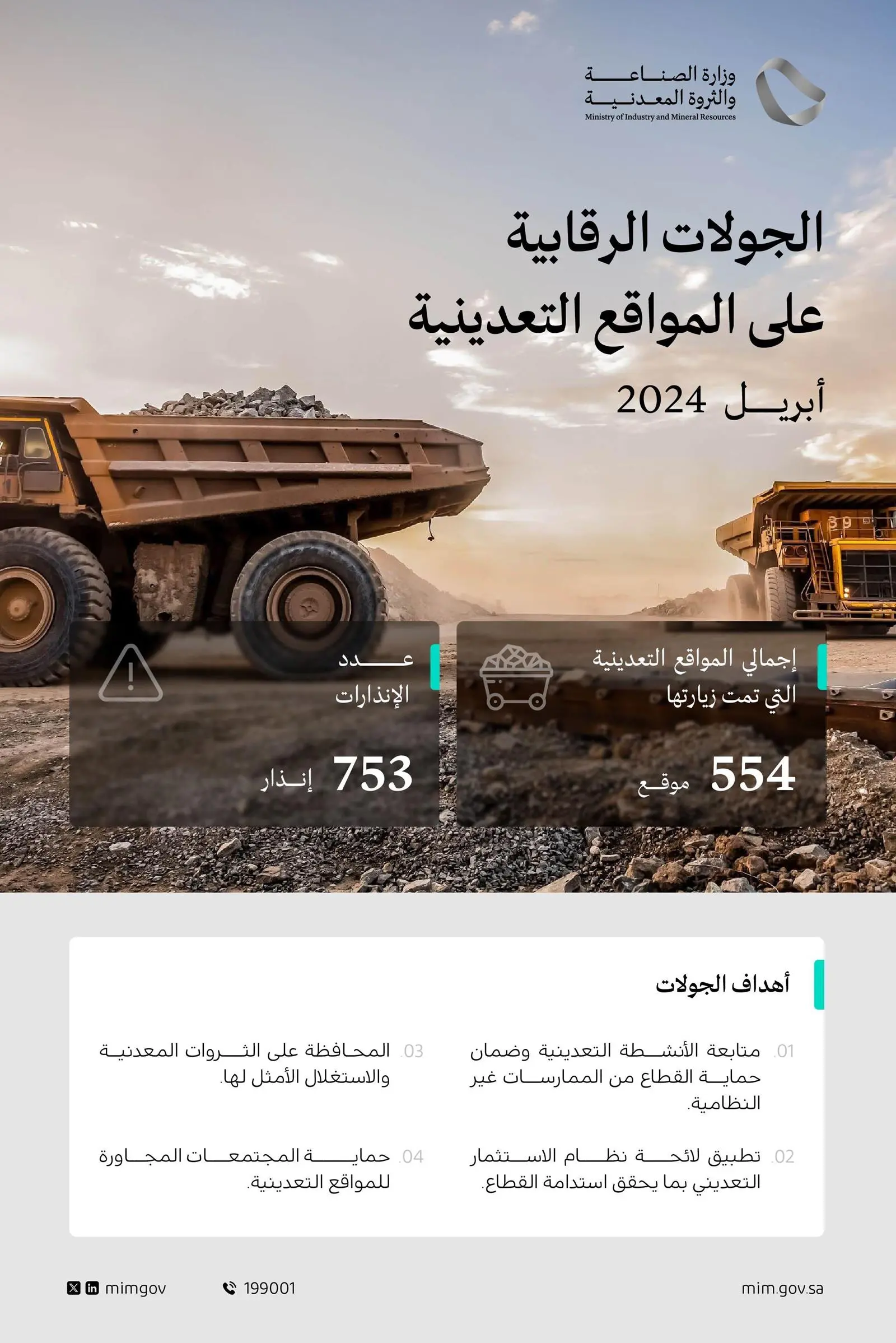 نفذت وزارة الصناعة والثروة المعدنية -ممثلة بوكالة الامتثال والرقابة التعدينية- 554 جولة رقابية على عددٍ من المواقع التعدينية في مختلف مناطق المملكة خلال شهر أبريل الماضي، ووجهت 753 إنذارًا على المواقع التعدينية المخالفة لنظام الاستثمار التعديني، وذلك تطبيقًا لمبدأ الإنذار قبل إقرار المخالفة.