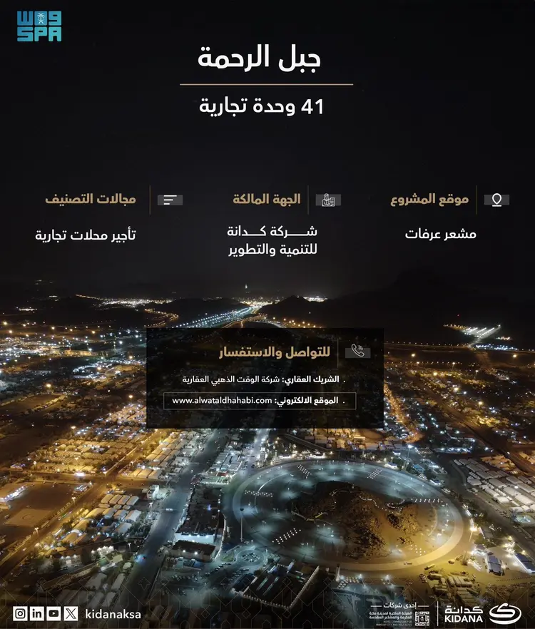 أعلنت شركة كدانة للتنمية والتطوير -المطور الرئيس للمشاعر المقدسة وحماها والذراع التنفيذي للهيئة الملكية لمدينة مكة المكرمة والمشاعر المقدسة- عن طرح‬ 41 وحدة تأجيرية جديدة بمنطقة جبل الرحمة بمشعر عرفات؛ وذلك بهدف رفع كفاءة جودة الخدمات المقدمة للحجاج والزوار.